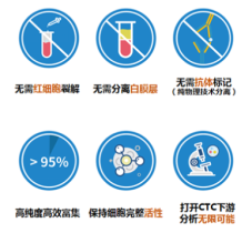 高效精准:CTC 回收率>95%,红细胞去除率≈100%,白细胞去除率>99%,可从 1ml 含数十亿血细胞的样本中精准捕获 1-50 个 CTC;