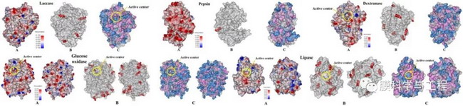 | (A)不同酶表面荷电情况(红色:负电荷;绿色:正电荷);(B)可能的共价键合位点(红点:赖氨酸)和(C)表面亲疏水性(紫色:疏水区域;蓝色:亲水区域) |