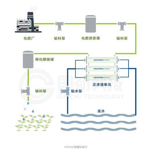 农业用水是目前世界上淡水资源消耗的主要领域之一,FO技术完美的发挥了正向渗透的特点,选择生活污水或工业污水为原液,高浓度的肥料母液为汲取液,稀释后的汲取液(不需要再生)用于灌溉,所以整体工艺合理,将原来的先过滤再使用的两步过程简化为一步完成,以更低的能耗实现污水的过滤回用。