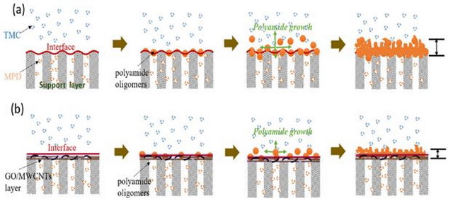 图5.将氧化石墨烯/多壁碳纳米管复合层引入聚酰胺形成过程的模型