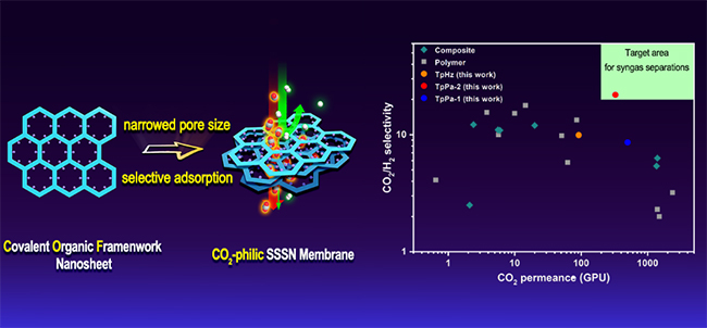 在碳达峰碳中和的国家战略目标背景下,发展低能耗、环境友好的CO2选择性分离膜具有重要意义和实际应用价值。高性能二维分离膜是该研究领域前沿性研究议题。二维共价有机框架(covalent organic frameworks,COFs)具有永久性一维直通孔道,丰富的表面官能团以及优异稳定性,在CO2分离领域具有巨大应用潜力。然而,目前二维COFs孔径大于0.8nm,对于动力学直径0.3~0.4 nm范围的小分子气体例如H2(0.29 nm)、CO2(0.33 nm)等难以实现精确分离,构建具有高效CO2分离性能的纯相二维COFs膜面临极大挑战。