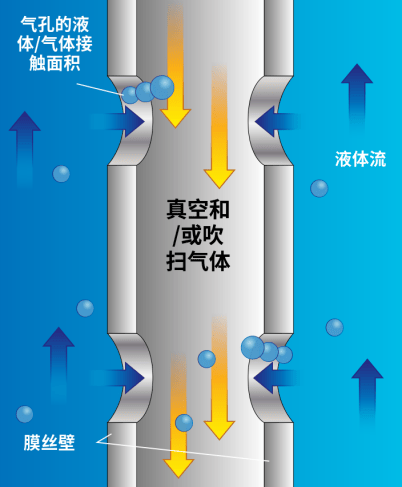 膜除氧原理为:在透气不透水的膜丝外侧液体流过,膜丝内侧通过真空/扫气改变气体分压。让液体中的溶解性气体(氧气、二氧化碳、氮气等)不断透过膜丝壁,被带出膜组件外部,从而可以精准控制水中气体的含量。目前膜除氧技术可稳定将水中溶解氧脱除到1ppb(μg/L)以下,二氧化碳脱除到1ppm(mg/L)以下。