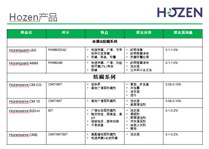 HOZEN可为日化行业,如:个人护理湿巾、婴儿湿巾、厨房湿巾、面膜、洗面奶、洁面乳、洗手液、护手霜、眼霜、彩妆、乳液、洗发水、染发素、护发精华素、保湿水、保湿霜、保湿乳、爽肤水、洗衣液、洗衣皂、防晒霜、美白霜、怯斑霜等化妆品、洗涤护理用品提供完整的微生物控制解决方案。产品类型包括复合型、温和型、低刺激型、低敏感型、广谱型、高效型、快速型等全功能产品。
