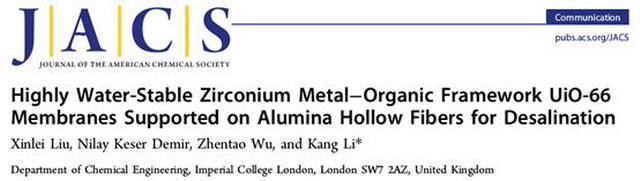 2015年伦敦帝国理工学院化学工程系Liu Xinlei等人于化学顶级期刊J. AM.CHEM.SOC.上发表了自己的研究成果——原位溶剂热合成法制备的以氧化铝中空纤维为载体成功制备了Zr-MOF膜(UiO-66膜)。该膜基于尺寸排阻原理,表现出优异的多价离子截留性能(对Ca 2+ 、Mg 2+ 、Al 3+离子的截留率分别为86.3%、98.0%、99.3%),并且具有中等渗透率(0.14 Lm-2 h-1 bar-1)和良好的渗透性(0.28 Lm-2 h-1bar-1 μm)。同时该膜具有较好的稳定性,在各种盐溶液进行了长达170小时的测试,膜性能未发生退化。
